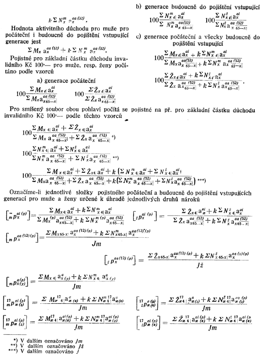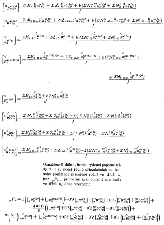 Jednotlivé složky pro výpočet hodnot pojistného jsou patrny ze vzorců uvedených na tab. XLIII, počítaných pro počáteční i budoucně do pojištění vstupující generace. Tabulka XLIV a XLV podává rozklad průměrného pojistného, počítaného podle uvedených vzorců pro všecky složky nárokové pro obě pohlaví.