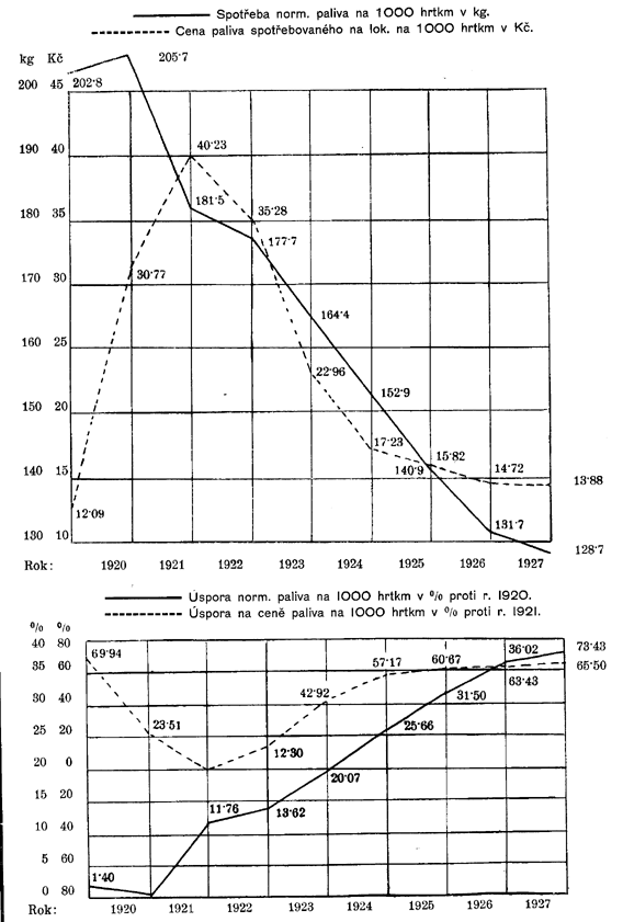 | Spotřeba norm. paliva na lokomotivách na 1.000 hrubých tunových kilometrů v kilogramech | 145,4 | 202,8 | 205,7 | 181,5 | 177v7 | 164,4 | 152,9 | 140,9 | 1317 | 128,7 |