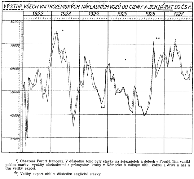 | 2,254.822 | 2,245.813 | 99% | 3,564.775 | 3,342.389 | 93% | Nedostatek speciálních krytých a otevřených vozů přes 10 m dlouhých, jakož i otevřených vozů v době anglické stávky. | |