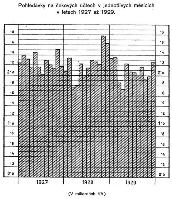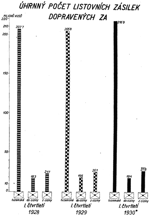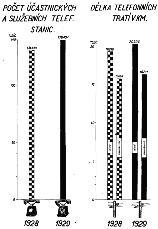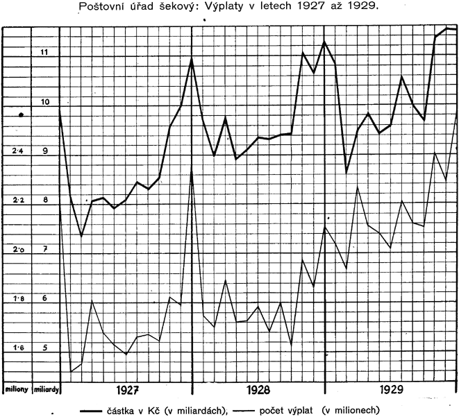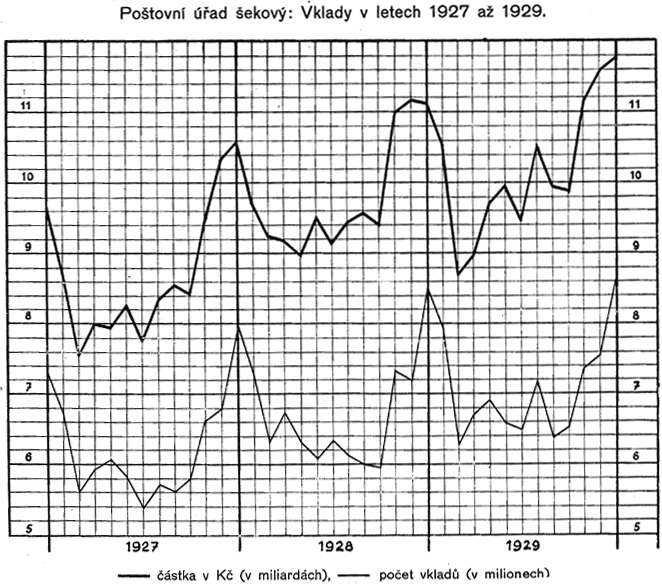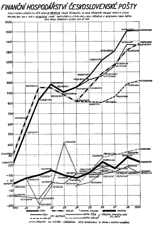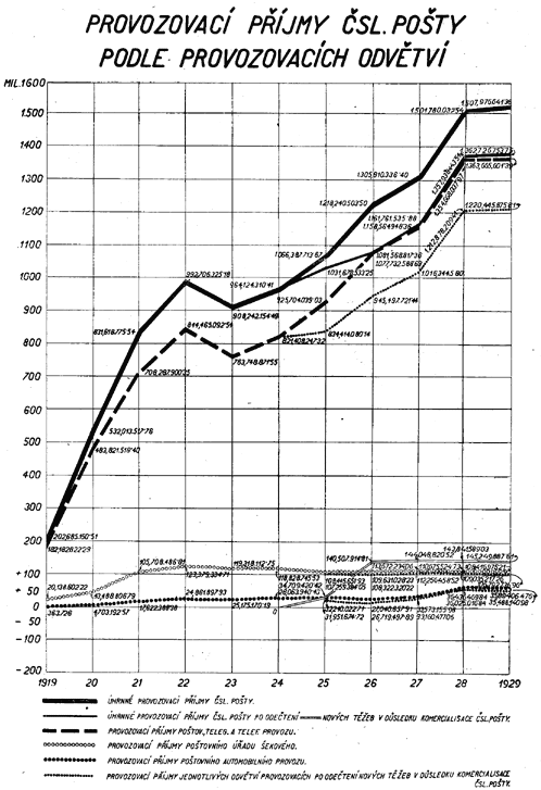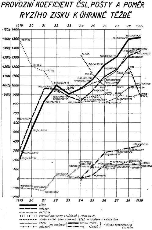 Z diagramu znázorňujícího vývoj finančního hospodářství Čsl. pošty (tab. č. XXXI.) jest přesvědčivě zřejmý trvalý vzestup těžeb, který byl přerušen toliko v r. 1923 a 1924 jednak v důsledku snížení některých poplatků poštovních telegrafních a telefonních, jednak proto, že všeobecně poklesla intensita poštovního, telegrafního a telefonního provozu důsledkem hospodářské krise, související s deflací. Deflace způsobila také první pokles nákladů Čsl. pošty (v r. 1922), které i v letech 1923 a 1924 rychle klesaly v důsledku trvalého uplatňování hospodárnosti poštovní správou, a byly by i v letech 1925 a 1926 poklesly, kdyby podnik nebyl převzal na svůj účet zejména pense a jiná nová břemena. Vzestup provozovacích nákladů v roce 1927 a 1928 souvisí se vzrůstem intensity dopravy, jest však daleko předstižen vzrůstem provozovacích příjmů. Naproti tomu v roce 1929 vzrůst provozovacích nákladů převýšil dosažený vyšší provozovací příjem, a to, jak již bylo zmíněno, v důsledku ochabnutí mimořádně příznivé hospodářské konjunktury let 1927 a 1928.