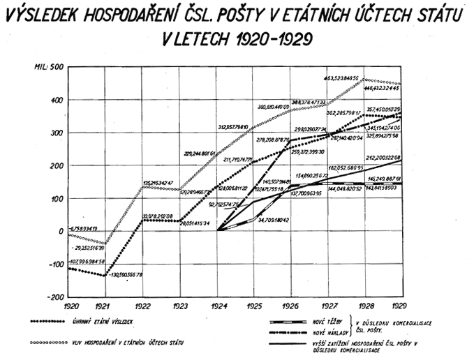 Z rozpětí mezi výsledky hospodaření jednotlivých let období 1920 až 1929 a prvního roku čsl. poštovní a telegrafní správy jest zřejmo, že hospodaření pošty prokazuje značné úspěchy i s hlediska úzce fiskálního. Tyto rozdíly výsledků jednotlivých let a prvního roku značí totiž částky, o něž se postupně zlepšovaly výsledky celostátního hospodářství tím, že poštovní správa účelně a cílevědomě hospodařila. V roce 1929 zlepšil se její dosažený hospodářský výsledek proti výsledku za rok 1919 úhrnem o 446,432.324,45 Kč, takže poštovní správa zlepšením výsledku svého hospodářství také přispěla podstatně k zajištění aktivity celkového státního hospodářství ve srovnání se stavem roku 1919.