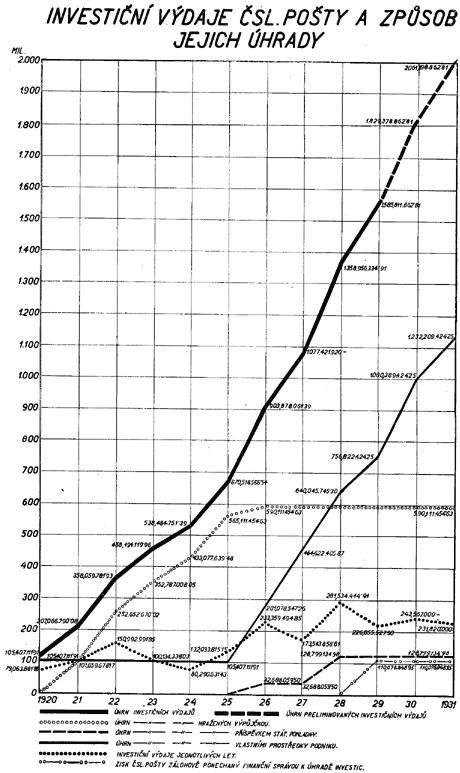 Investiční výdaje Čsl. pošty a způsob jejich úhrady jsou vyznačeny na diagramu č. XXXVI., z něhož jest zjevno, že v letech 1921 až 1925 byly investiční výdaje poštovního, telegrafního, telefonního a automobilního provezu uhrazeny výhradně jen z výtěžku investičních půjček státní správy finanční, a že teprve v letech 1926 až 1928 byla největší část investičních nákladů uhrazena ziskem, ponechaným Čsl. poště jako další vklad státu do podniku. V roce 1929 byl podnik nucen k úhradě 48,53% investičních výdajů použíti zisku, ponechaného finanční správou jen zálohově, a zbývající část (51,47%) investičních výdajů uhraditi vlastními prostředky. Naproti tomu v letech 1930 a 1931 má Čsl. pošta najíti úhradu investic nejen ve vlastních prostředcích, ale i v zisku podniku skutečně ponechaném jako další vklad státu do podniku.