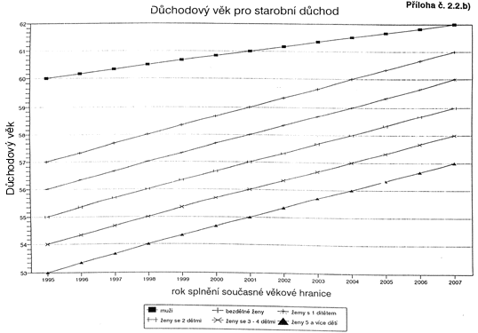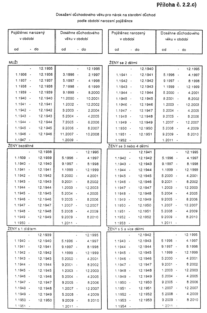 | 1996 | 60 r. + 2 měs | 57 r. + 4 měs | 56 r.+ 4 měs | 55 r. + 4 měs | 54 r. + 4 měs | 53 r. + 4 měs |